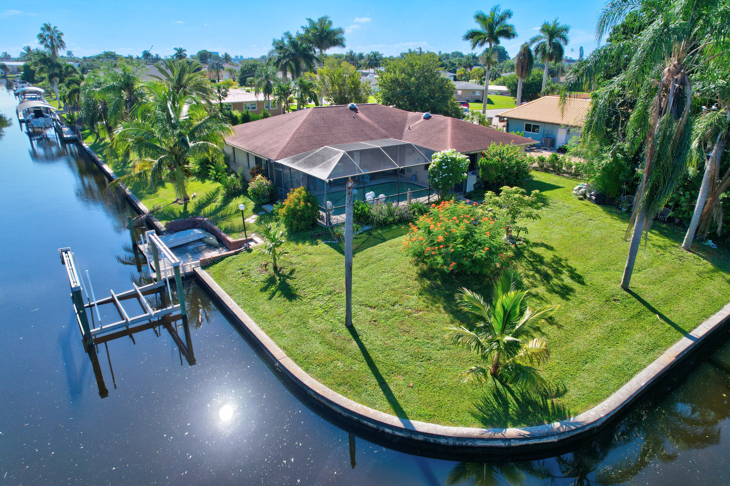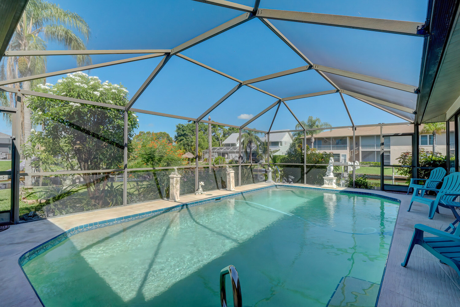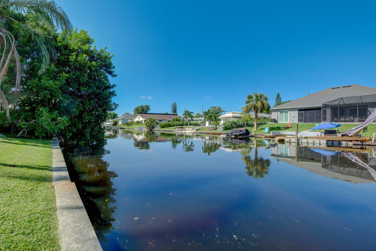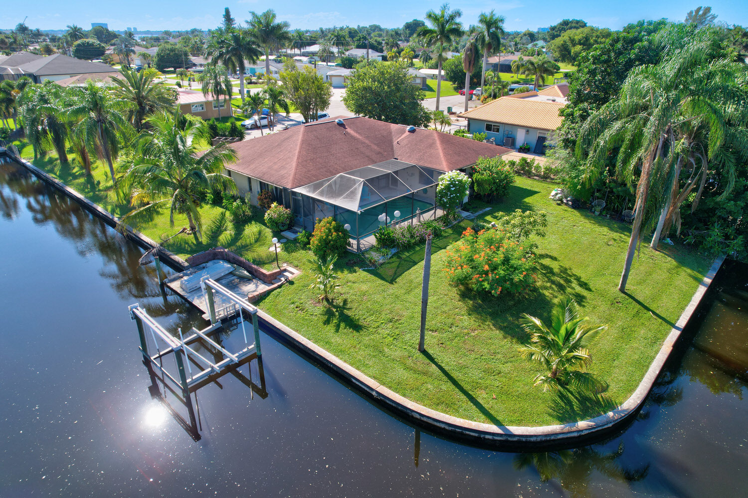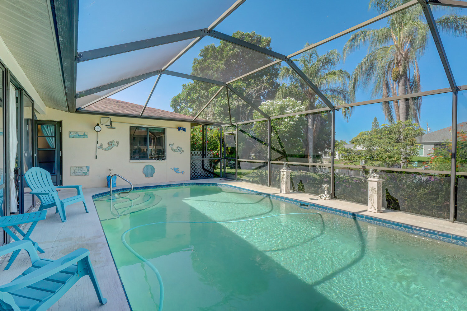 Brand new roof. Did NOT flood! A true boater’s paradise located on intersecting canals in the Yacht Club area of Cape Coral, this gulf access pool home is just minutes from the Caloosahatchee River and a short boat ride to the Gulf of Mexico. The premium waterfront lot with almost 276 feet of seawall, a concrete dock, and a 10,000lb boat lift provides ample room to navigate and play. Overlooking the expansive waterfront is a large pool surrounded by a caged lanai and a screened in porch, all west facing to accentuate your enjoyment of the SW Florida sunsets. The house itself is located on a quiet cul-de-sac on an oversized corner lot which provides extra privacy. The interior of the house is nicely appointed with high vaulted ceilings, plenty of natural light, access to the pool from the living area and main bedroom, plus a separate living and family room. The third bedroom overlooking the canal and pool area is currently being used as an office and is an ideal oasis for working from home. AC and hot water heater are two years old, toilets are ADA compliant, and the roof was replaced in 2012. Boating, fishing, watersports....you won't go wrong purchasing this perfectly situated home.